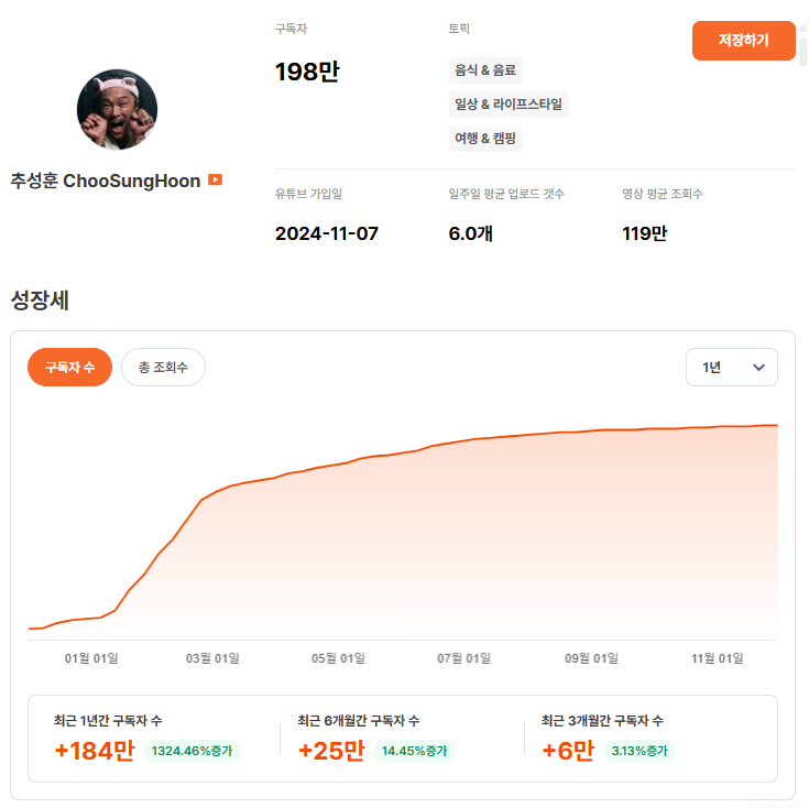 그중에서도 가장 대표적인 사례는 1위에 오른 추성훈입니다. 추성훈은 채널 개설 1년도 되지 않아 구독자 184만 증가(연 성장률 1,324%)라는 놀라운 성장을 기록 했죠.