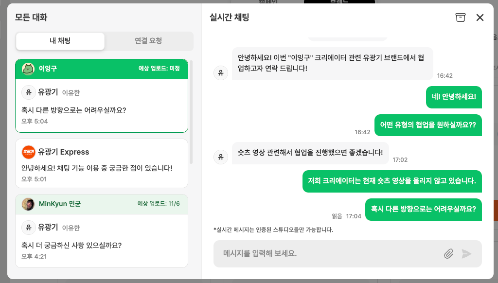 이제는 채팅으로 바로 대화를 열고, 캠페인 조건이나 일정 등을 실시간으로 조율할 수 있습니다.