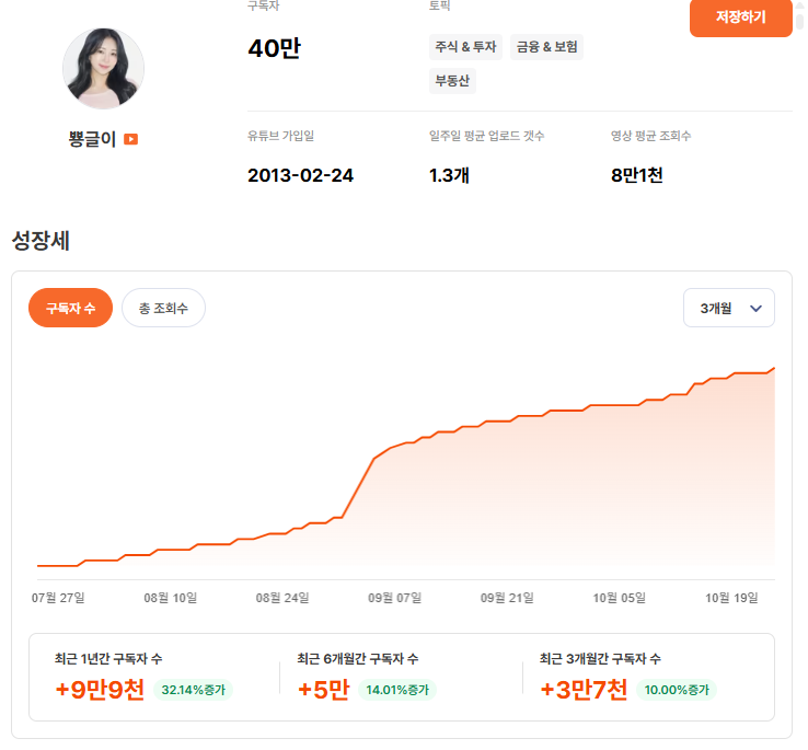 현재 구독자 40만 명, 최근 1년간 9만 9천 명 증가(32% 상승)라는 꾸준한 성장세를 보이며 경제·금융 콘텐츠 중에서도 보기 드문 친화적 전달력과 지속적 구독자 유입률을 자랑합니다.