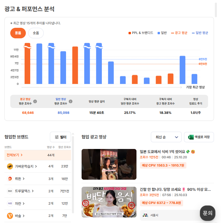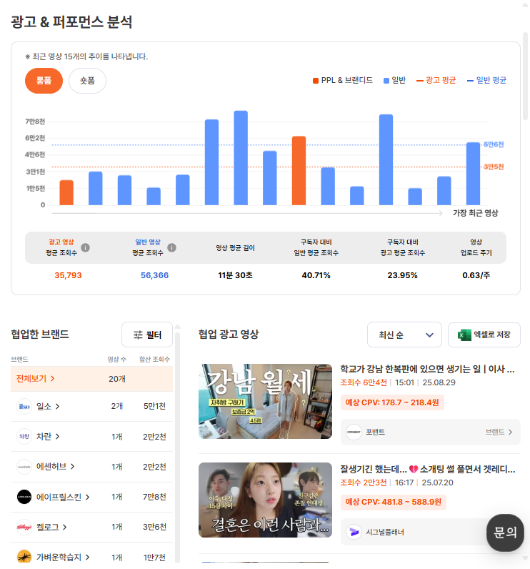 광고 영상의 평균 조회수는 3만 5천 회, 일반 영상 대비 약 64% 수준으로 안정적인 광고 효율을 유지하고 있으며 브랜드 협찬은 일스, 차란, 에이프릴스킨, 윌로그, 포맨트 등 총 20개 이상 브랜드로 다양합니다.