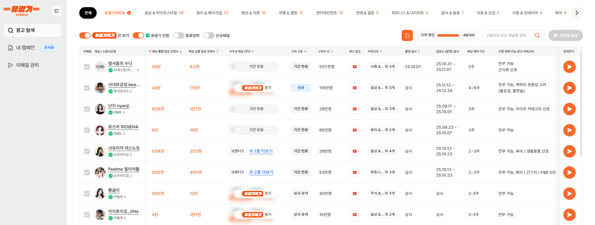 유광기 익스프레스는 협업 퍼포먼스 좋은 중대형 크리에이터 채널 및 셀럽, 연예인 채널의 긴급/신규 광고구좌 리스트와 관련 특가 정보 한 눈에 확인 가능하고 중간 단계없이 다이렉트로채널 담당자와 소통할 수 있도록 도와드리는 플랫폼입니다.