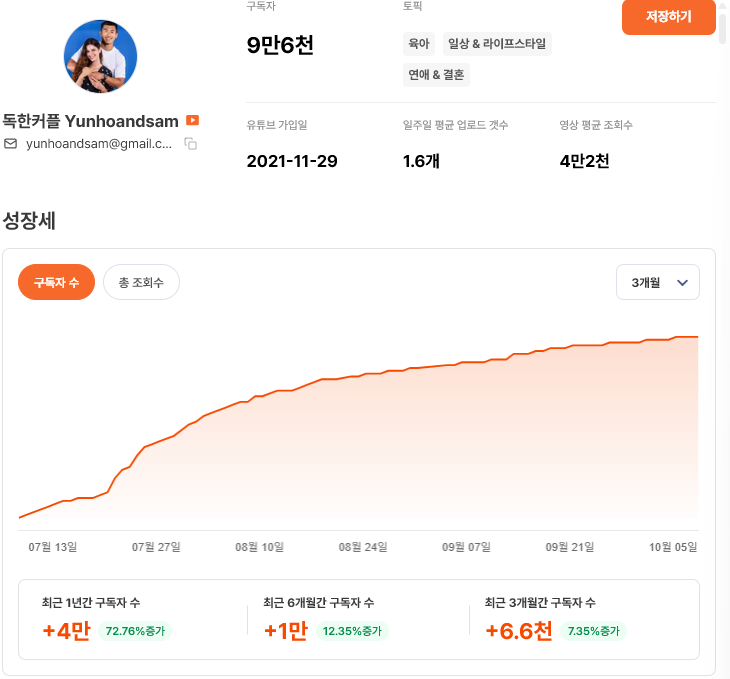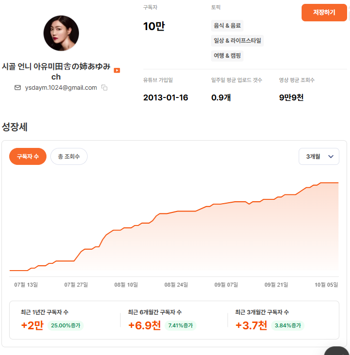 최근 3개월간 구독자 수가 4,500명 이상 증가하며 10만 명 돌파를 눈앞에 두고 있으며 일상과 육아, 문화 교류를 중심으로 꾸준한 성장세를 보이고 있습니다.