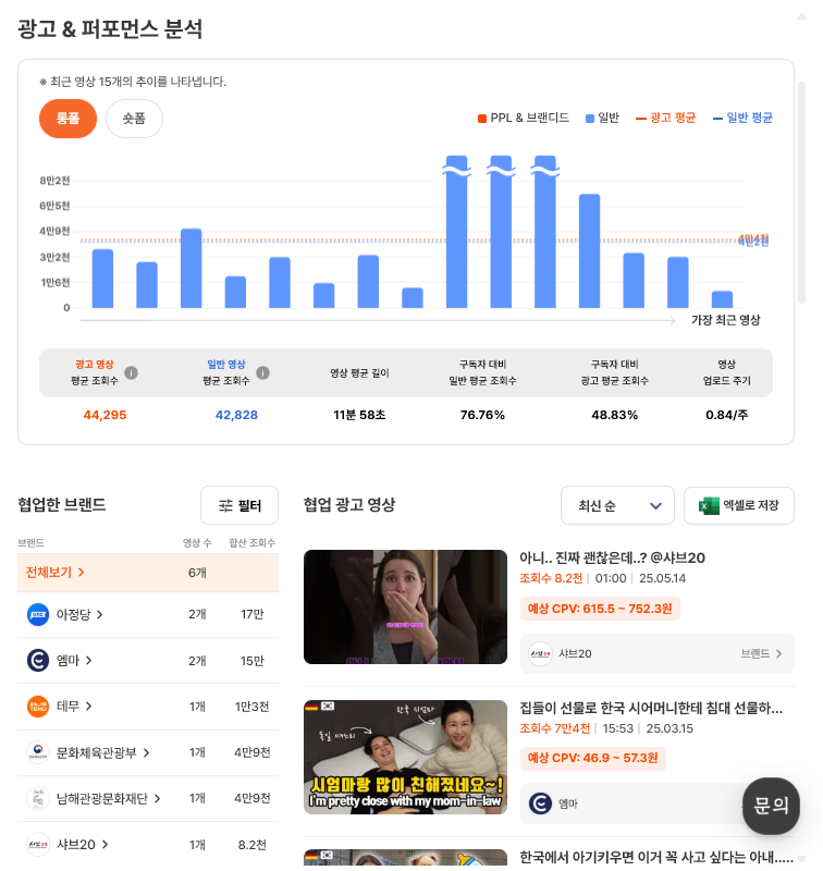 광고 영상의 평균 조회수는 44,000회로 일반 영상 대비 거의 동일 수준(약 104%)을 기록하며 평균 영상 길이는 12분 내외로, 브랜드 메시지를 녹이기 충분한 구성입니다.