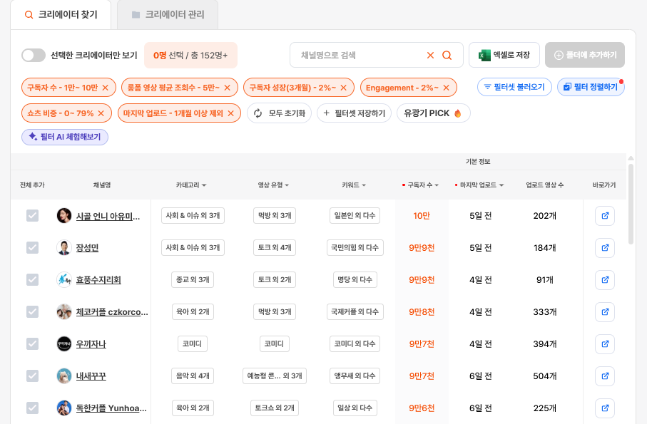 떠오르는 채널을 가장 먼저 찾아내고 싶다면 유광기에서 라이징 크리에이터를 리스트업해보세요!