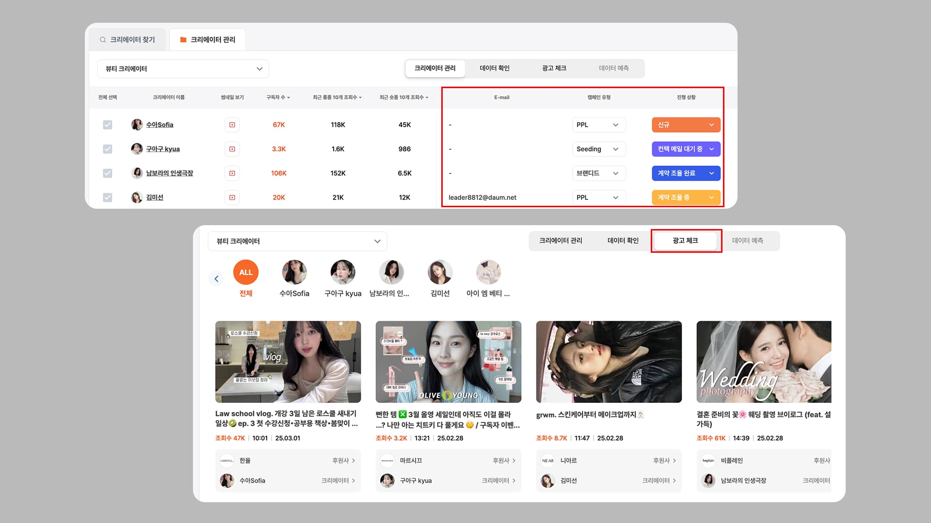 개별 크리에이터의 데이터 비교는 물론 컨택 진행 현황 등을 업데이트하여 놓치는 일 없이 성수기 마케팅을 준비할 수 있습니다.