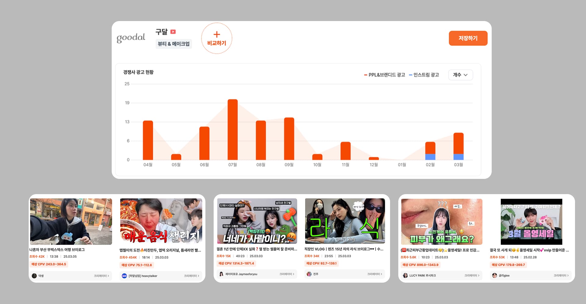 이렇게 특정 기간에 집중적으로 유튜브 PPL을 진행할 때 전략적으로 크리에이터를 배치하려면 다양한 데이터를 봐야 합니다.