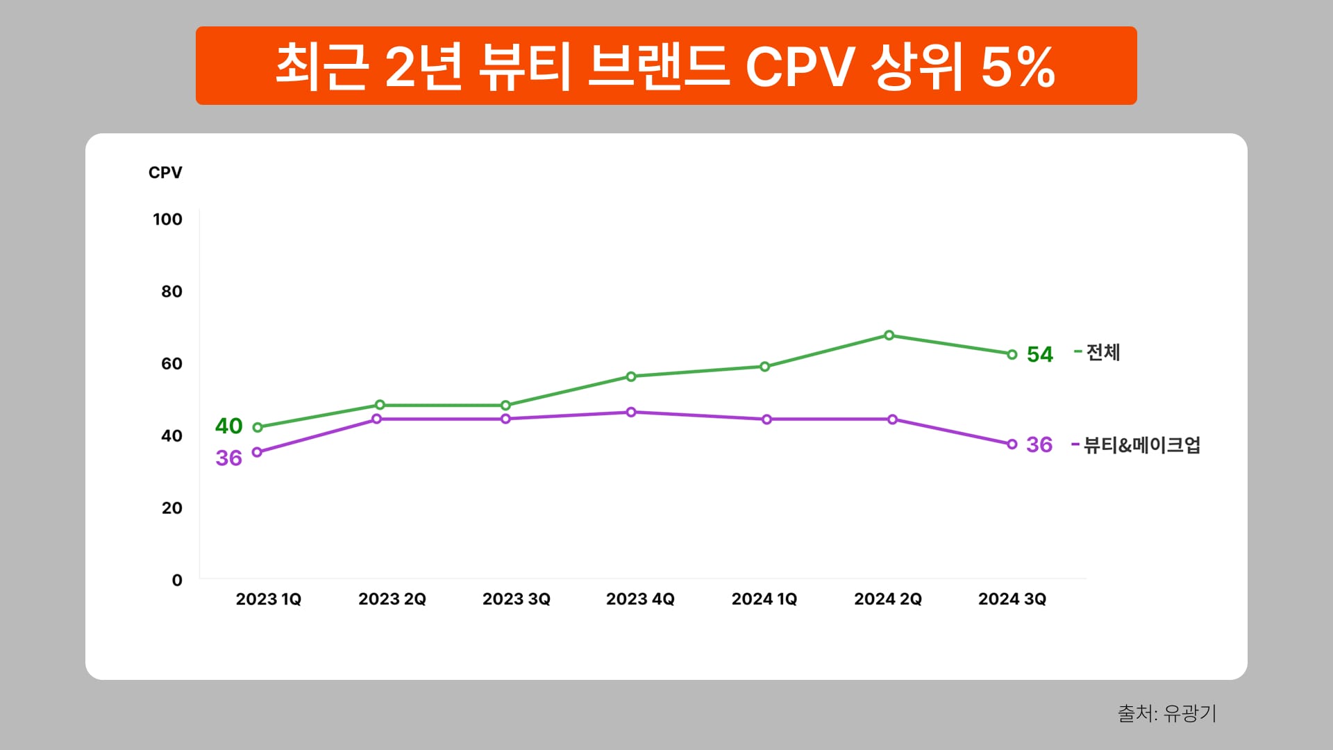 유광기에서 파악한 최근 2년 간 뷰티 카테고리의 광고 효율은 전체 카테고리에 비해 높은 편입니다.