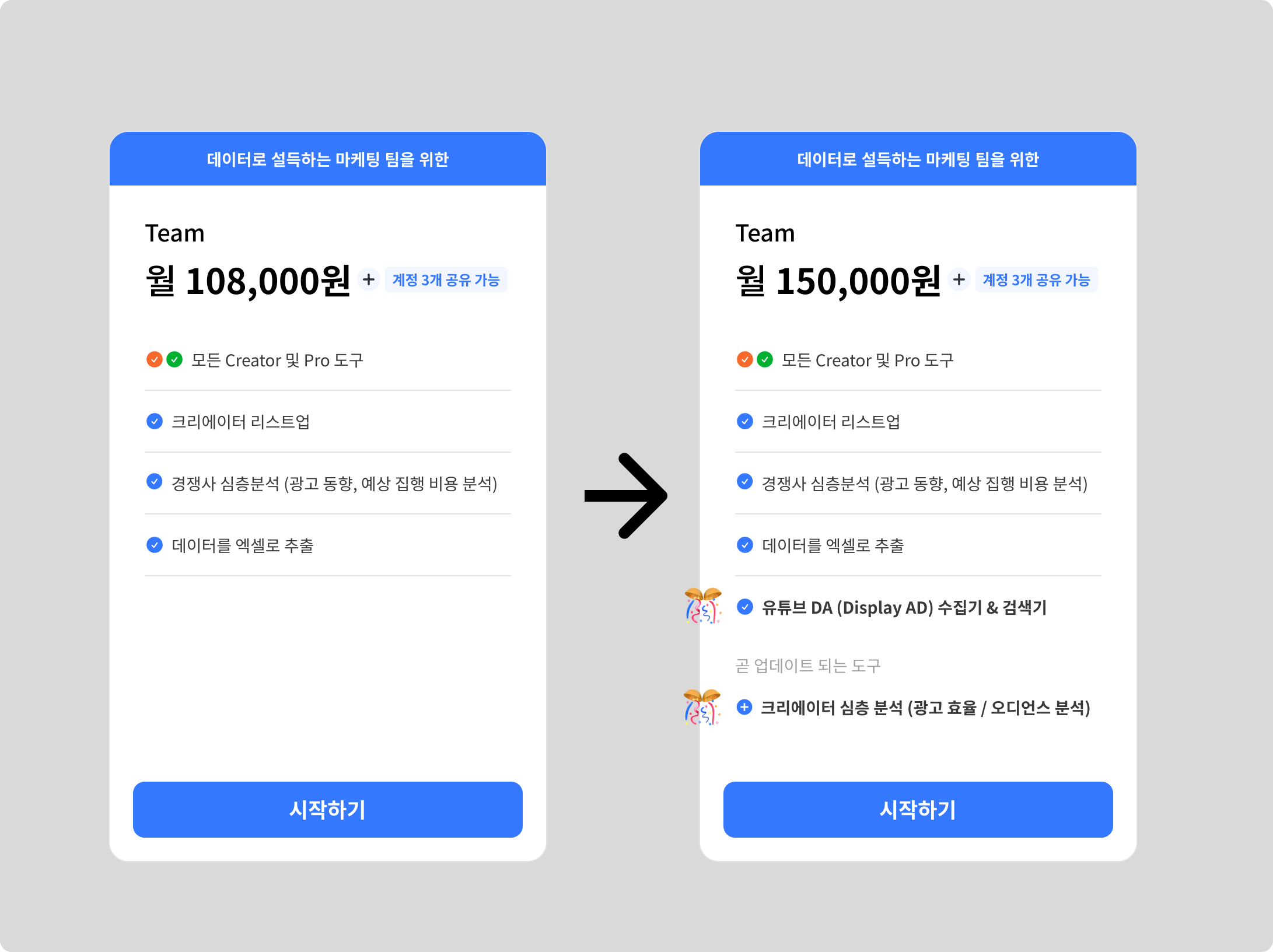 이제 유광기 Team 플랜 하나로 팀원분들께 천만 유튜브 광고 래퍼런스 라이브러리를 제공하실 수 있게 되었습니다.