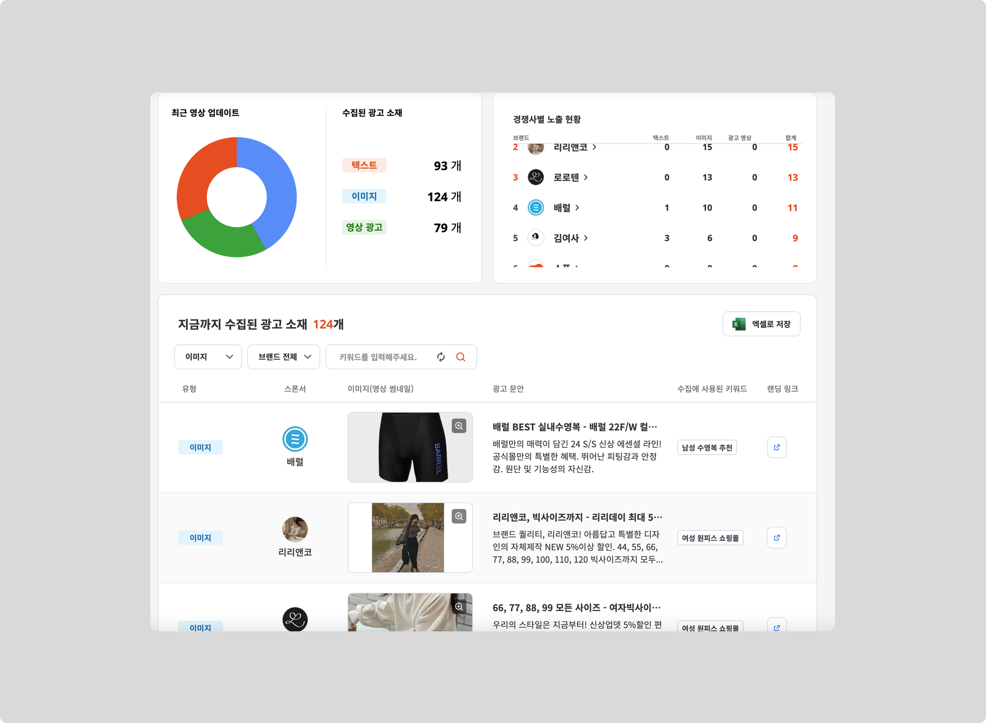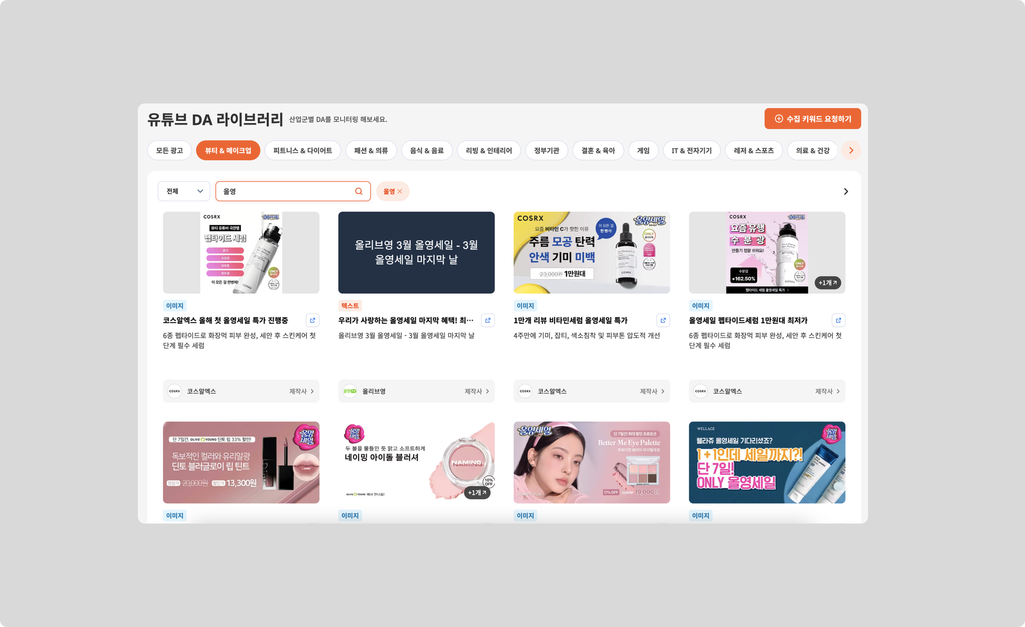 기존의 경쟁사별 브랜디드 & PPL 광고 분류와 유튜브 인스트림 광고 분류에 더해 디스플레이 광고 소재 수집까지 더해져, 유광기는 이제 유튜브 매체 안에서 다양한 방법으로 광고를 준비하거나 기획하는 팀에게 필수적인 도구가 되었습니다.