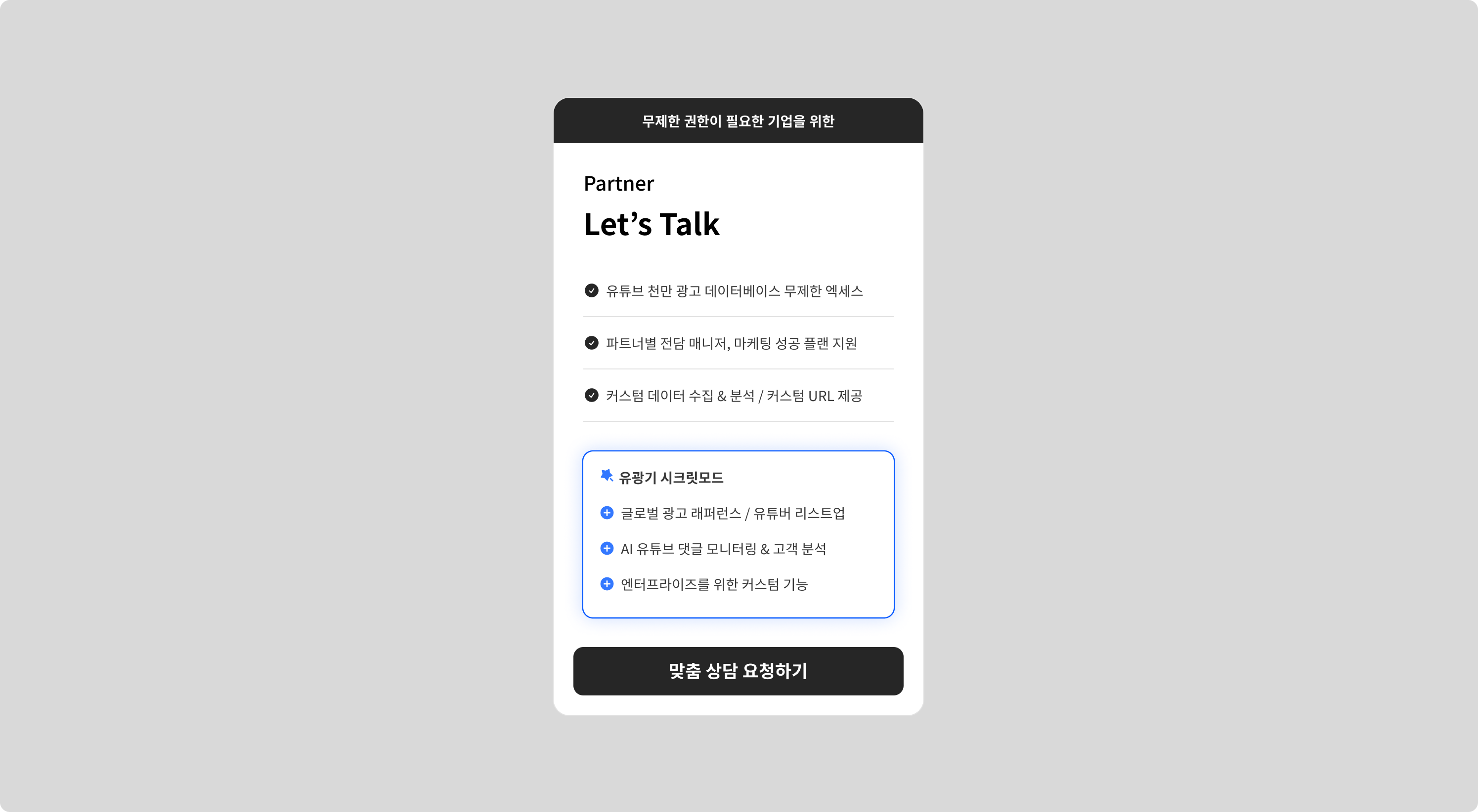 파트너스 플랜은 개별 고객사 분들의 업무 프로세스에 최대한 밀착되어 효율 & 결과 개선을 목표로 DIY 기능을 준비하며, 유광기가 수집하는 국내 & 글로벌 데이터를 고객사가 마케팅에 120% 활용하실 수 있도록 하는 것을 목표로 합니다.