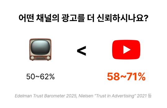 오히려 TV 광고 신뢰도는 50~62%인 반면 유튜브 광고는 58~71%로 더 높다고 하죠.