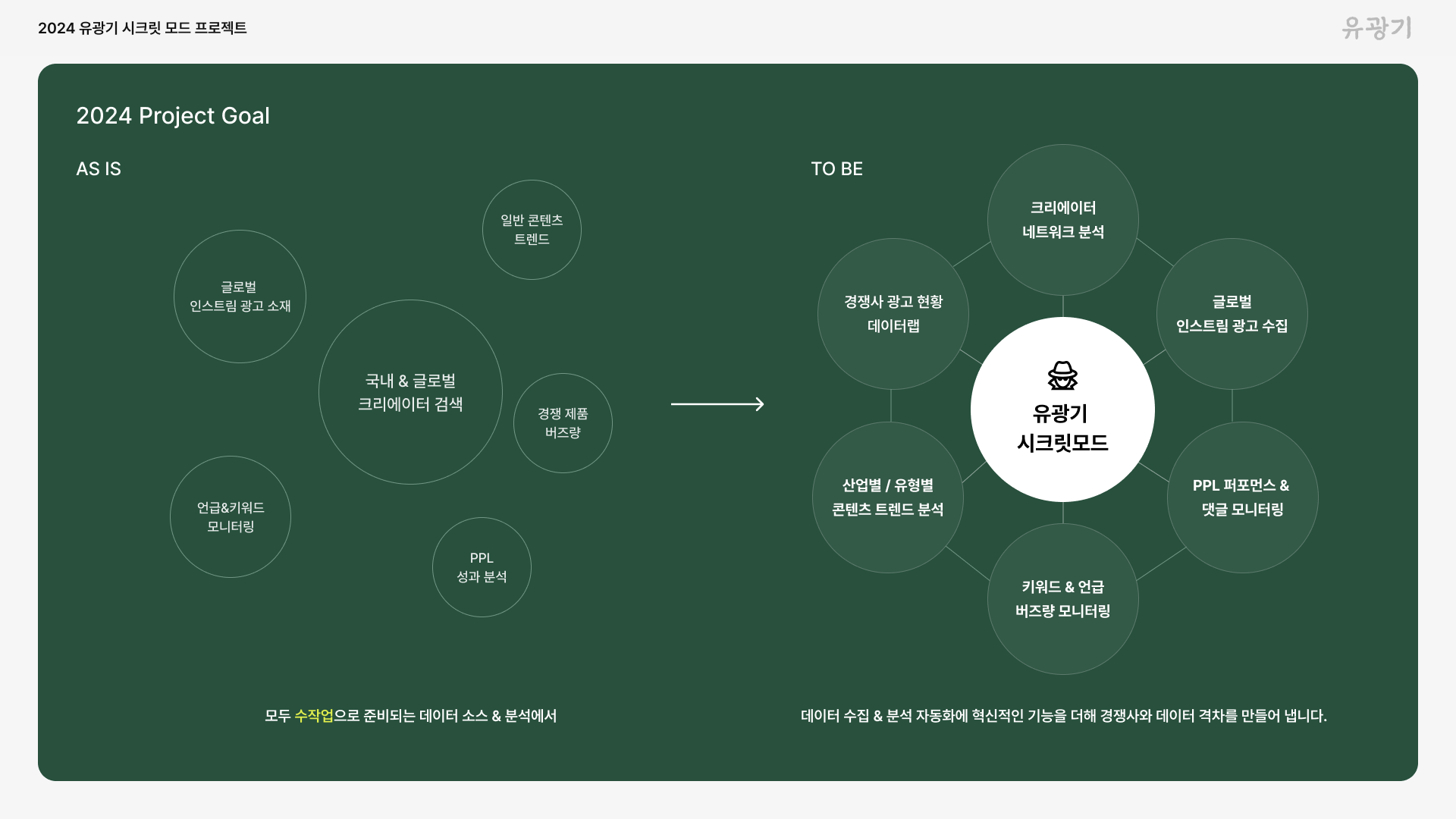 점점 더 어려워지는 Data-driven 마케팅 의사결정을 핸즈온으로 지원하고 각 기업의 고유한 업무 프로세스와 데이터 니즈에 맞춰 분석 도구를 개발하고 제공하는 유광기 시크릿모드의 첫번째 기능 - 유튜버 데이터베이스 v1.0 서비스를 시작하였습니다.