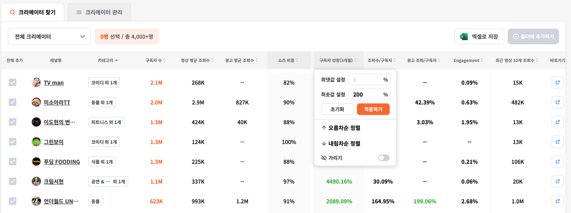 - 최근 3개월 구독자 성장률 최소값을 200%로 설정 합니다.