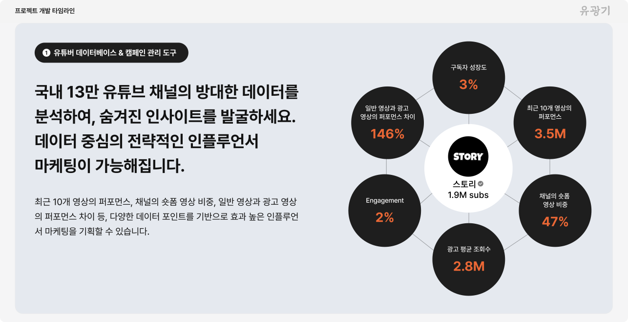 유광기는 야구의 세이버메트릭스 (Sabermetrics) 에서 영감을 받아 유튜버의 퍼포먼스를 분석하고 리스트업의 효율을 최대화 할 수 있는 새로운 유튜브 데이터베이스 기능을 론칭하게 되었습니다.